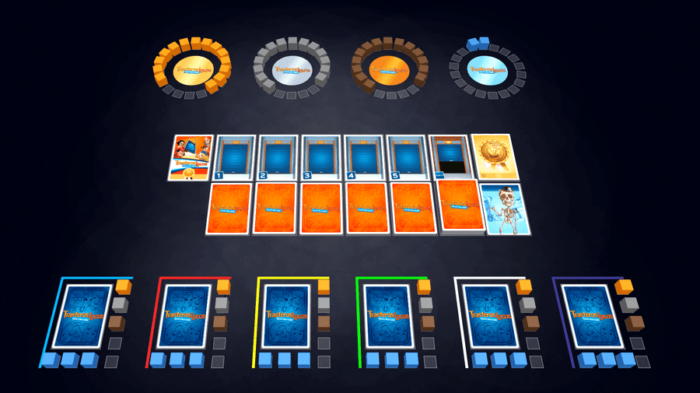 Frontal de la caja del juego de mesa PhrayaDetalle del tablero con las barcazas y las tiendas