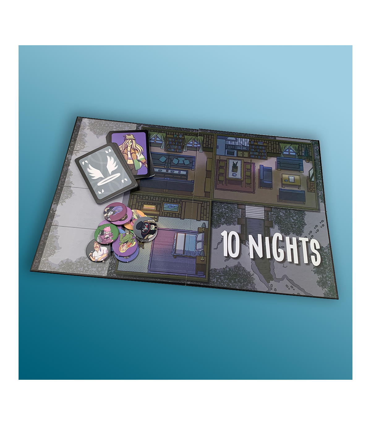 10 NIGHTS es un juego de roles ocultos que seguro que hará disfrutar a todos los jugadores. Este juego facilita unas reglas sencillas apoyadas en una app para controlar el tiempo de juego durante el día y la noche, así como un tablero de juego de la casa rural y fichas y cartas de los 12 personajes.