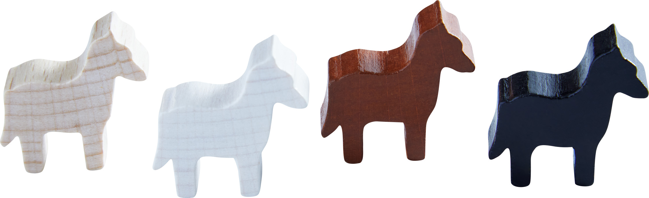 Contenido: 2 tableros, 4 caballos de madera, 4 marcos de depósito con 5 piezas de puzzle cada uno, 1 dado naranja, 1 dado verde