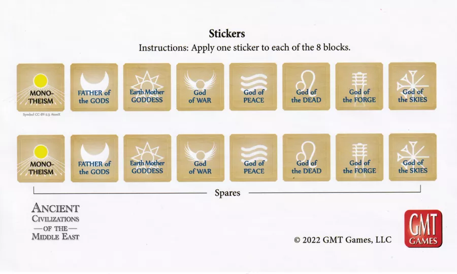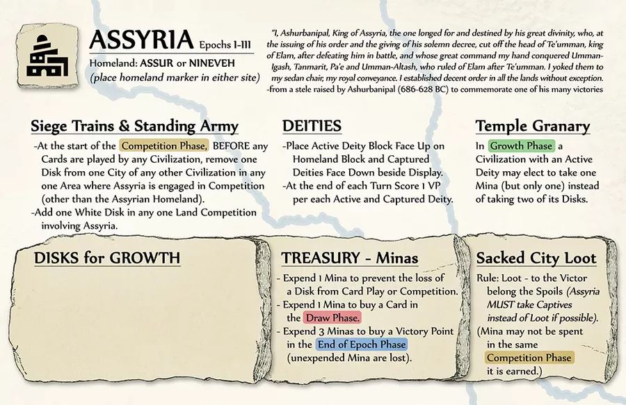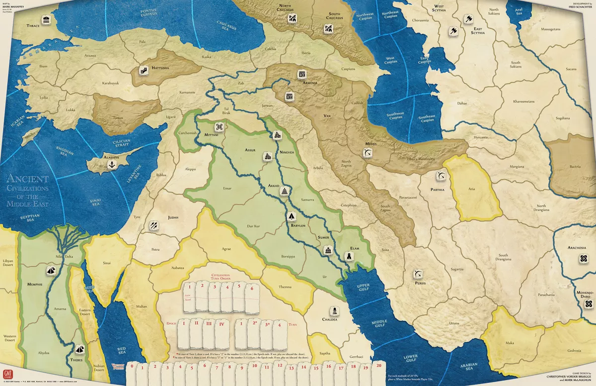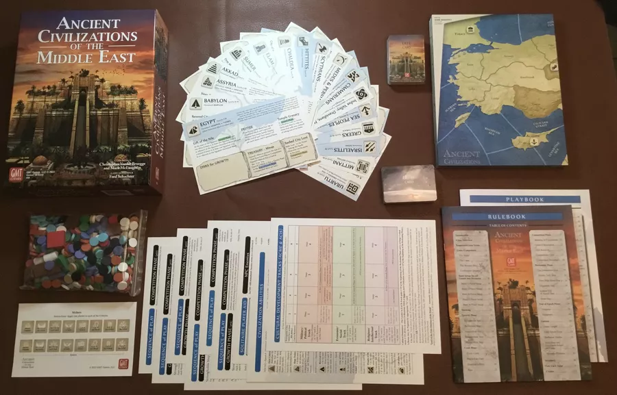 Si quieres un juego de guerra, lo tienes. Si quieres un juego amistoso, ¡este también lo es! Al igual que en Civilizaciones antiguas del mar Interior, las Civilizaciones antiguas de Oriente Medio pueden tener que ver con la guerra, pero no tiene por qué ser así. Puede ser un juego amistoso de exploración, construcción de ciudades, comercio y fe. Los jugadores (solitario, un grupo de hasta seis o incluso una combinación de jugadores en vivo con una civilización de dos o más impulsada por el sistema) pueden hacer de ACME lo que deseen o imaginen. La competencia puede ser marcial o cultural, bélica o amistosa, o una combinación de ambas; cómo se desarrolla el juego depende enteramente de cómo quieren que se juegue los jugadores. La duración del juego también depende de los jugadores: desde una odisea de varias horas de las cuatro épocas hasta una competencia más corta preestablecida de una o dos horas o hasta un umbral acordado de puntos de victoria por muerte súbita.
