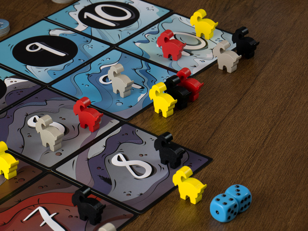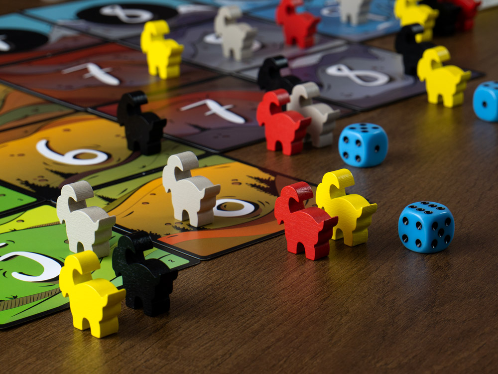 Lanza los dados y elige cómo combinarlos para que tus cabras escalen las montañas. Solo hay espacio para una cabra en la cima de cada montaña. Cuanto más tiempo permanezcas en la cima, más puntos obtendrás. Saber elegir el momento oportuno lo es todo en este juego. No solo tienes que llegar a la cima de la montaña, sino que tienes que hacerlo cuando estés seguro de que nadie pueda expulsarte de allí.