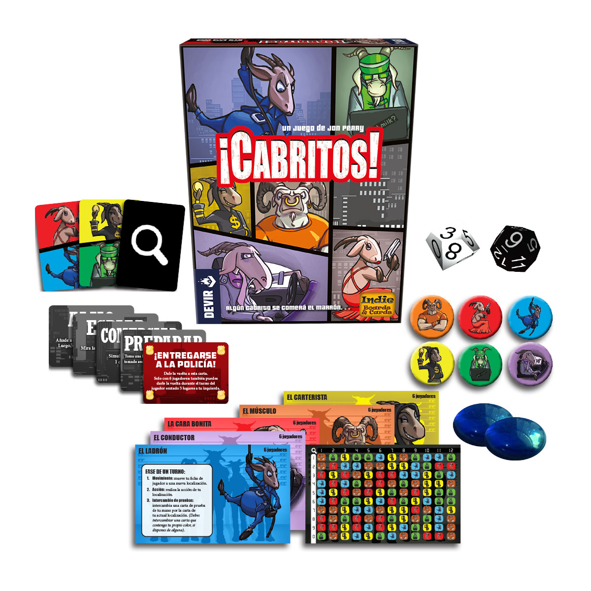 En ¡Cabritos! no puedes fiarte de nadie. Al empezar la partida repartiréis las tarjetas de jugador, lanzaréis los dados descodificadores y averiguaréis en secreto quien es (o quien creéis que es) el chivo expiatorio. Todos los jugadores excepto uno, obtendrán un mismo resultado. Sin embargo, no sabréis hasta el final de la partida en qué bando estáis.