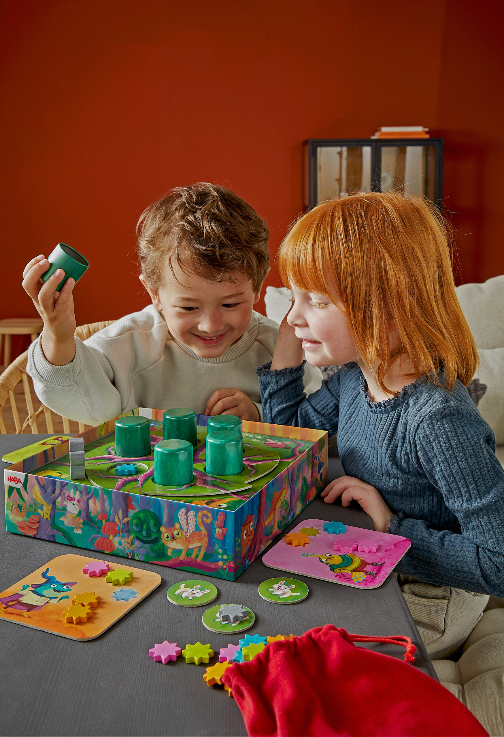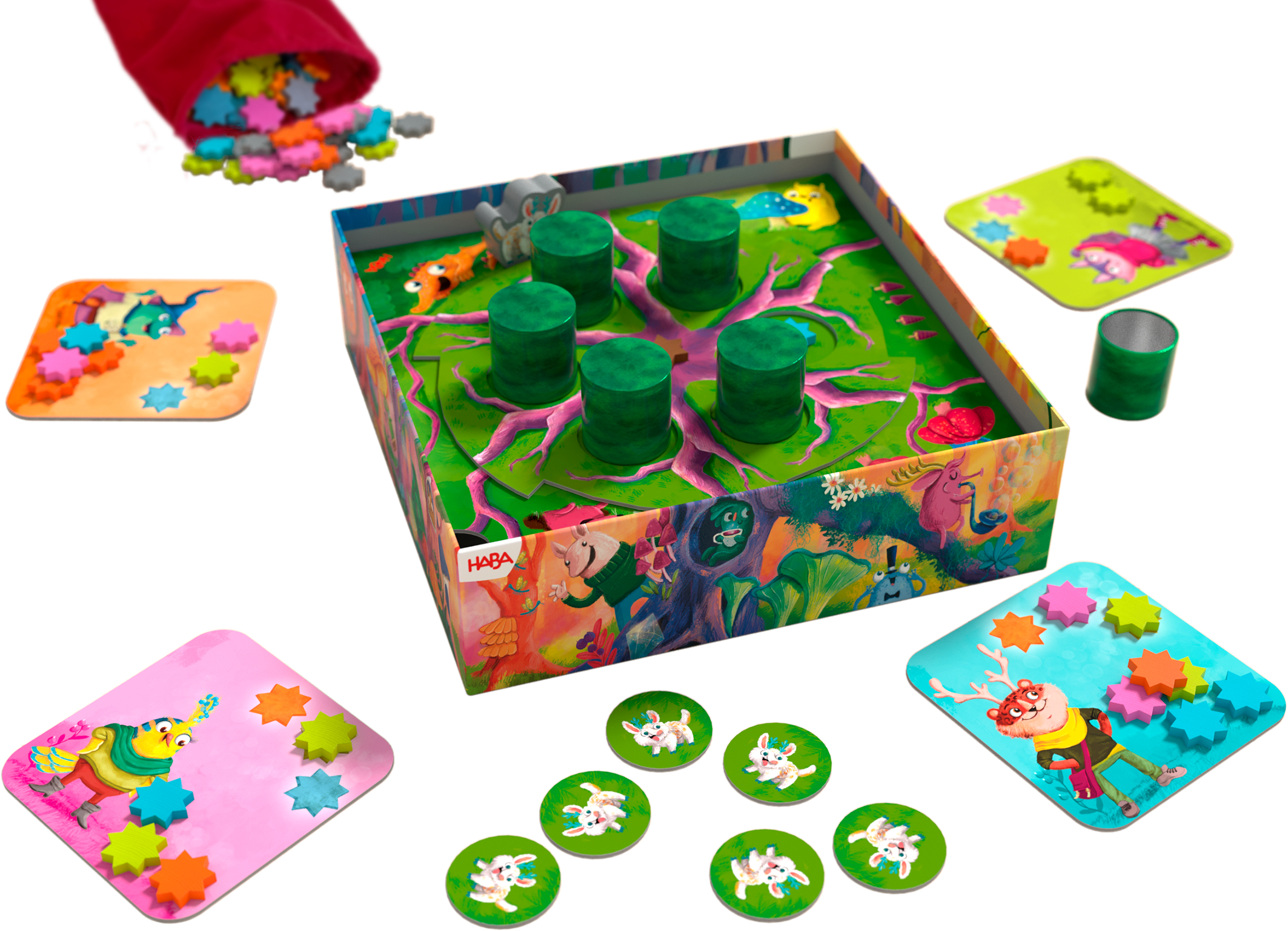 Contenido: 4 separadores, 1 suelo boscoso (tablero), 1 disco con raíces, 4 cartones para recoger estrellas (de 4 colores diferentes), 6 fichas de animales del bosque, 1 figura de madera de animal mágico del bosque, 48 estrellas40 estrellas de colores (10 por 4 colores diferentes), 8 estrellas grises, 1 árbol de estrella, 6 columnas de musgo (piezas metálicas), 1 bolsa de tela