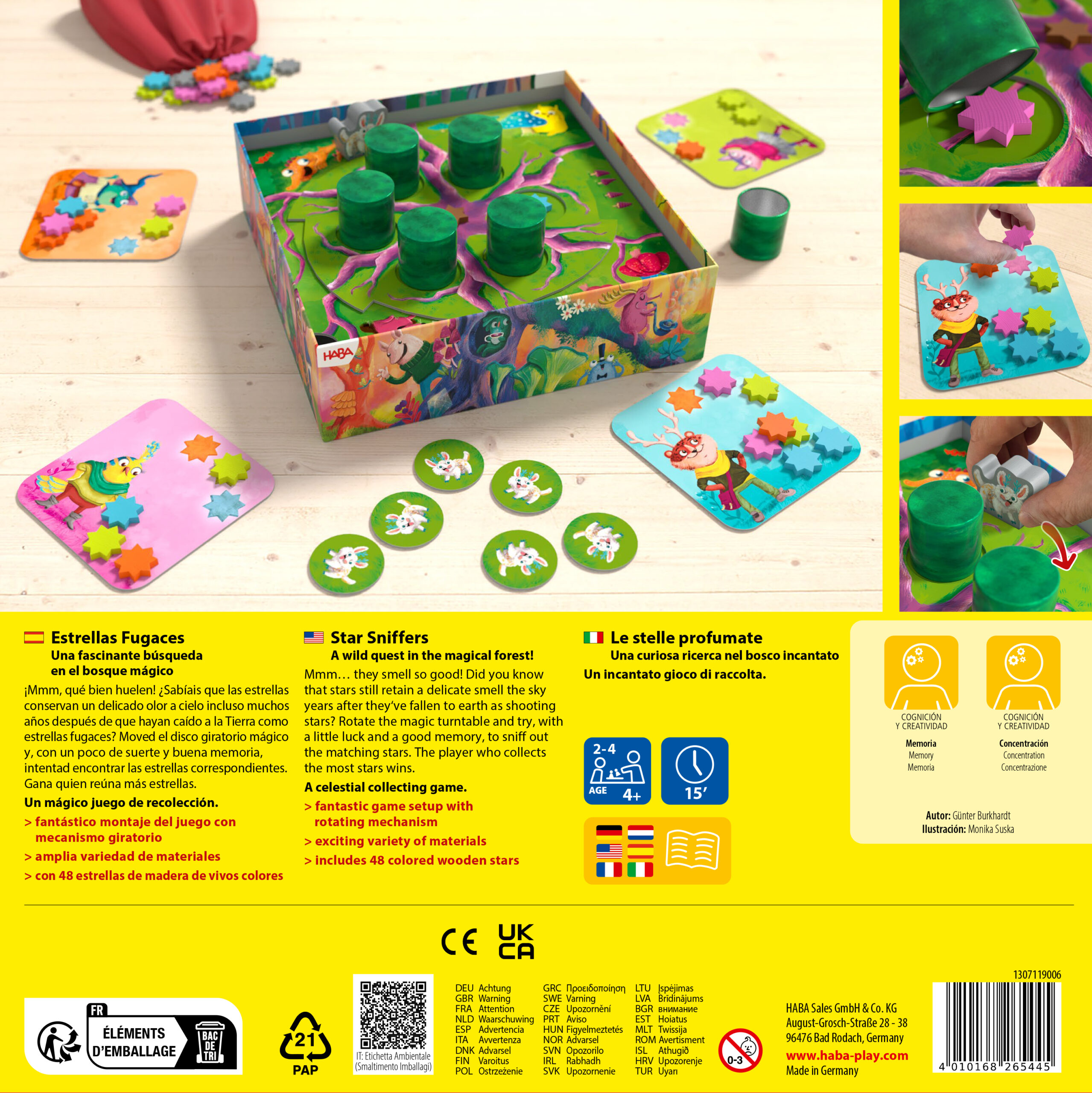La caja sirve de tablero de juego con un fascinante mecanismo de movimiento. Incluye 48 estrellas de colores de madera