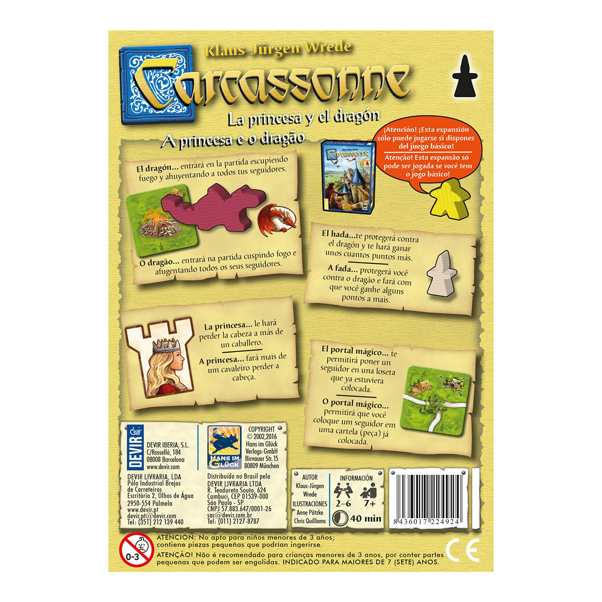 Carcassonne: La princesa y el dragón es una expansión del clásico juego de colocación de losetas Carcassonne, ganador del Spiel des Jahres 2001. En ella se añaden factores de caos y azar al juego, especialmente el dragón, que puede devorar a los meeples que pueblan el tablero ¡Si la princesa no lo impide!