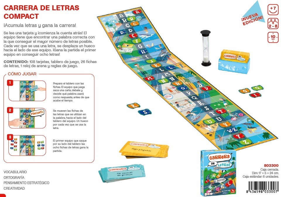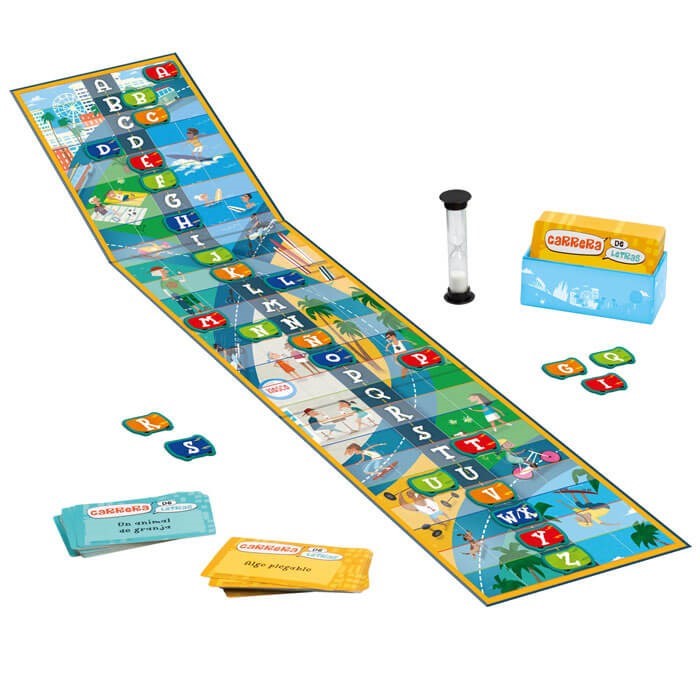 Se lee una tarjeta y ¡comienza la cuenta atrás! En Carrera de letras cada equipo tiene que encontrar la palabra correcta para conseguir el mayor número de letras posible. Cada vez que se usa una letra, se desplaza un hueco hacia el lado de ese equipo. ¡Gana la partida el primer equipo que logre sacar ocho letras por su lado del tablero!. Diviértete con Carrera de letras al mismo tiempo que adquieres vocabulario y mejoras tu lenguaje. Piensa, debate y elige con que palabra vas a competir contra el equipo oponente.