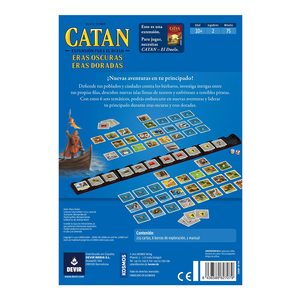 Eras Oscuras, Eras Doradas añade seis conjuntos temáticos separados que se pueden usar con el juego base. Un total de 215 cartas que se pueden usar por separado o combinadas con los sets que incorporaba el juego base Catan: el duelo.