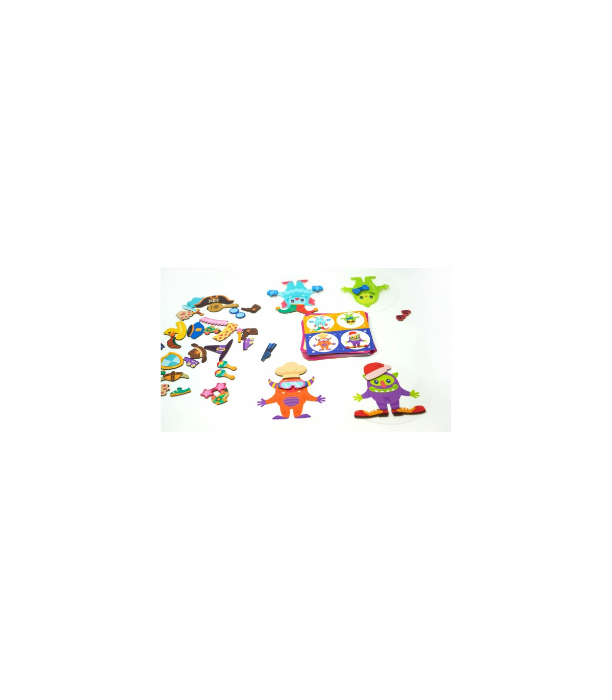 Cada jugador tiene su propio monstruo, en una pieza redonda de acrílico. Por otro lado, tenemos varios complementos y ropajes que se amontonarán sobre la mesa.
