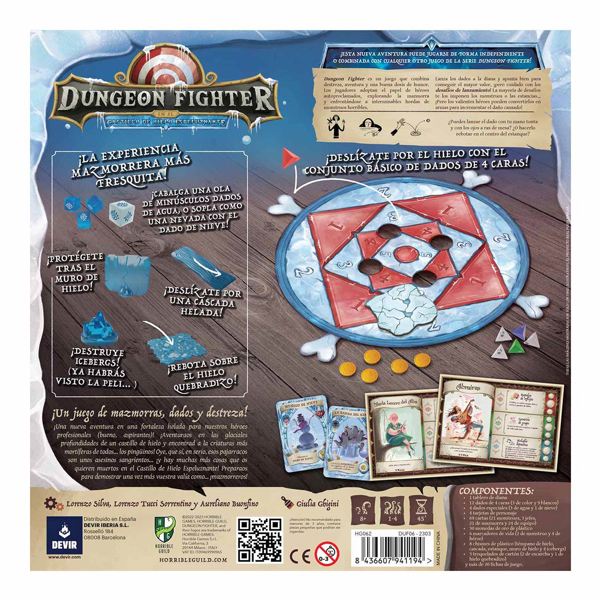 Dungeon Fighter en el castillo de hielo espeluznante puede jugarse de forma independiente o en combinación con cualquier otro juego de la serie Dungeon Fighter. Como novedad, esta edición incorpora 4 dados especiales (los 3 minúsculos dados de agua y el dado de nieve), 4 nuevos personajes, 21 monstruos, 3 jefes y un montón de nuevas cartas de equipo y de mazmorra. Y tampoco pueden faltar nuevos chismes de plástico para poner a prueba la habilidad de los jugadores: el muro de hielo, la cascada helada, el estanque quebradizo y los icebergs. ¡Que vuestros héroes no olviden la bufanda y los guantes!