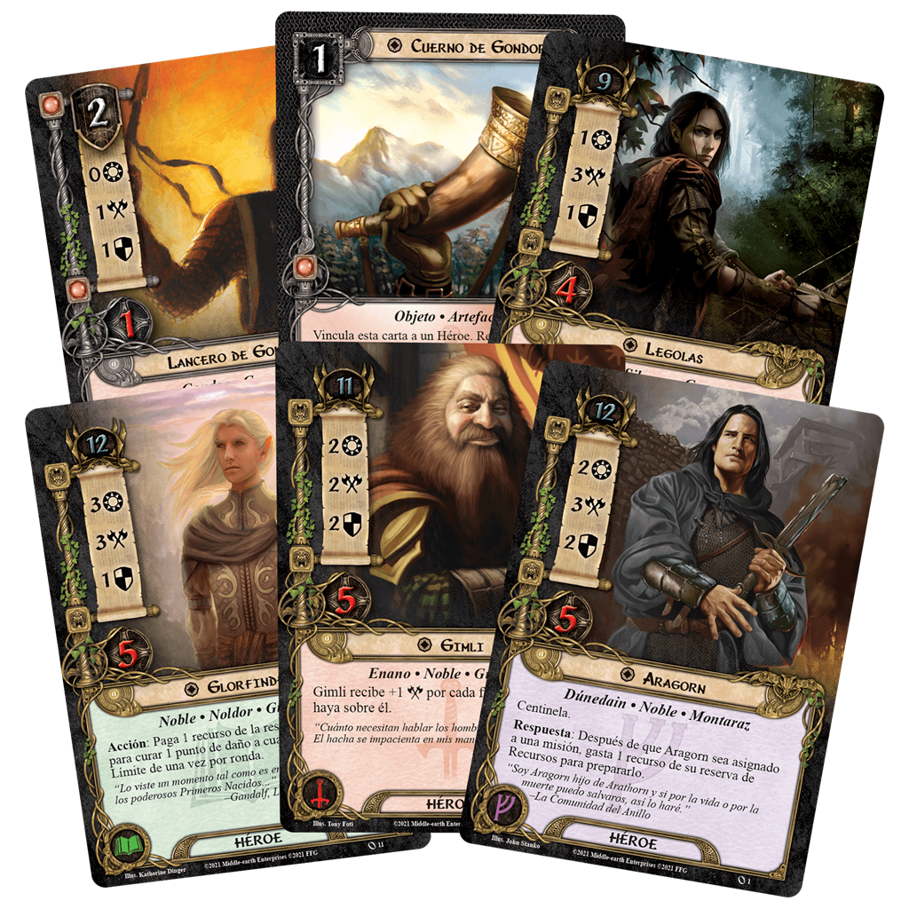 Cuaderno Aprende a jugar • Guía de referencia de reglas 226 cartas, divididas en: • 188 cartas de Jugador 12 cartas de Héroe • 84 cartas de Encuentro 10 cartas de Misión • 3 cartas de Campaña • 16 cartas de ayuda/carga • 57 fichas de Recursos • 66 fichas de Daño 66 fichas de Progreso • 4 marcadores de Amenaza 1 ficha de jugador inicial