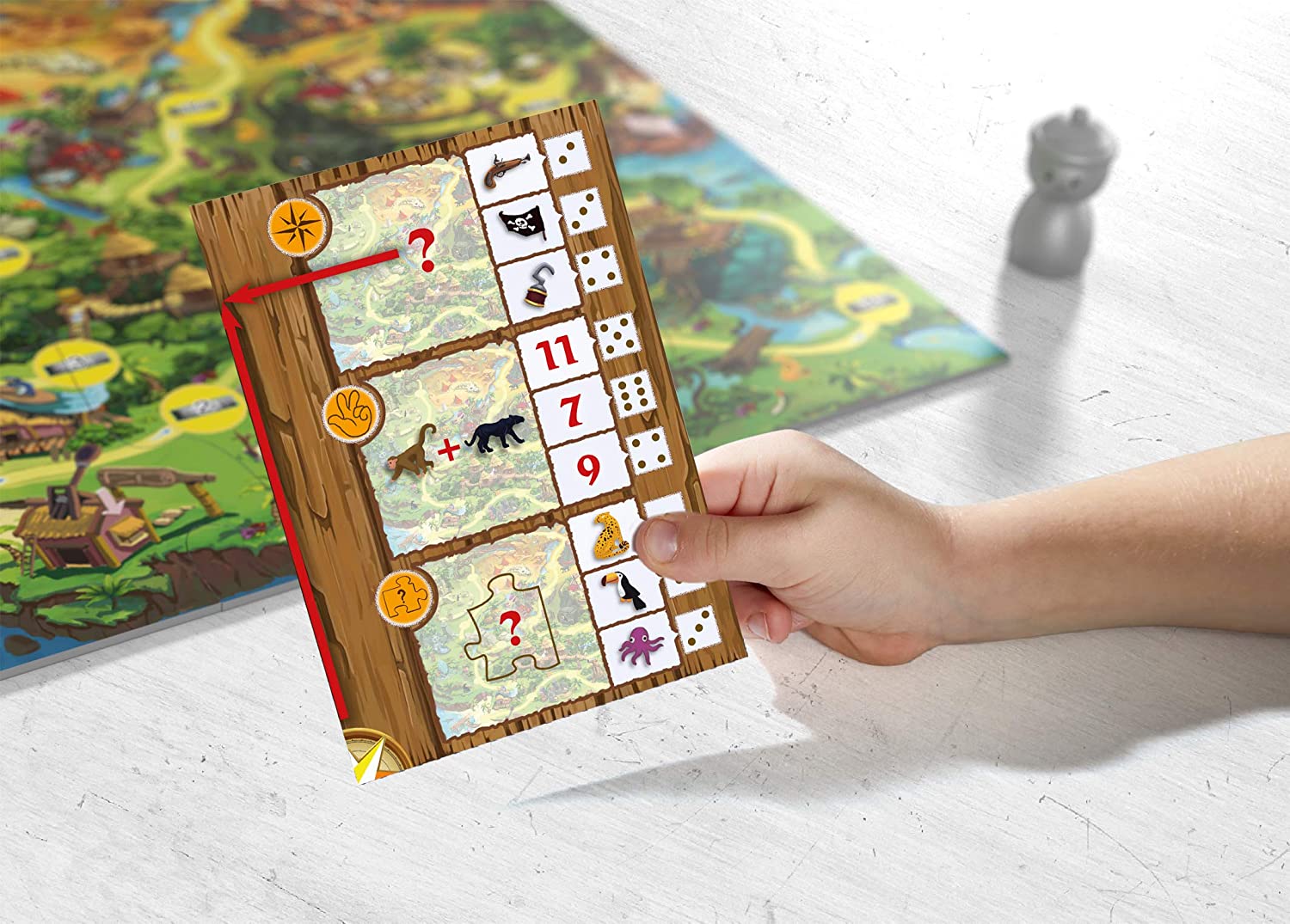Los jugadores/as inician una emocionante aventura de piratas y encuentran un cofre del tesoro sellado con un candado con combinación numérica. Para descubrir la clave, tendrán que resolver juntos los enigmas expuestos en la carta de enigma y avanzar con la figurita el número correcto de casillas del mapa del tesoro que habrán montado anteriormente como un puzzle. Solo de esa manera podrá abrirse el cofre del tesoro.