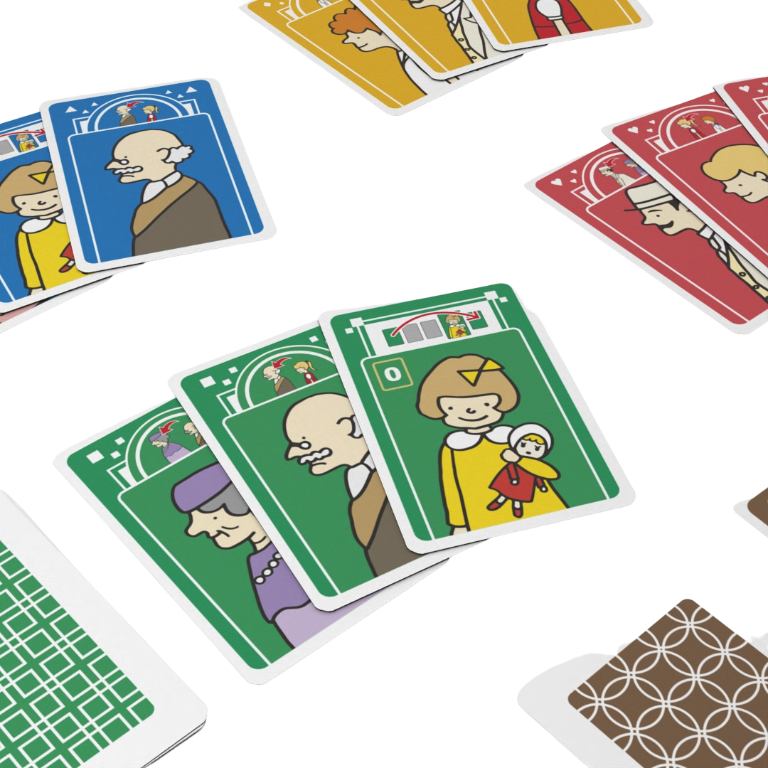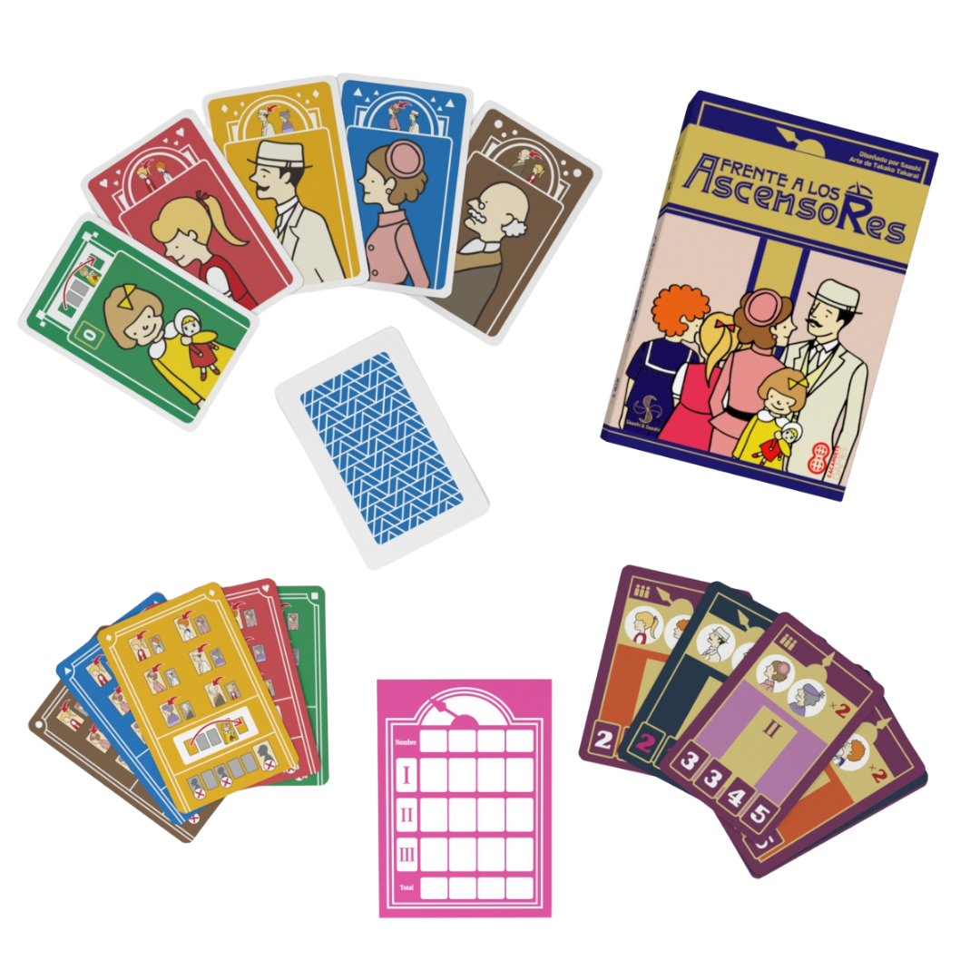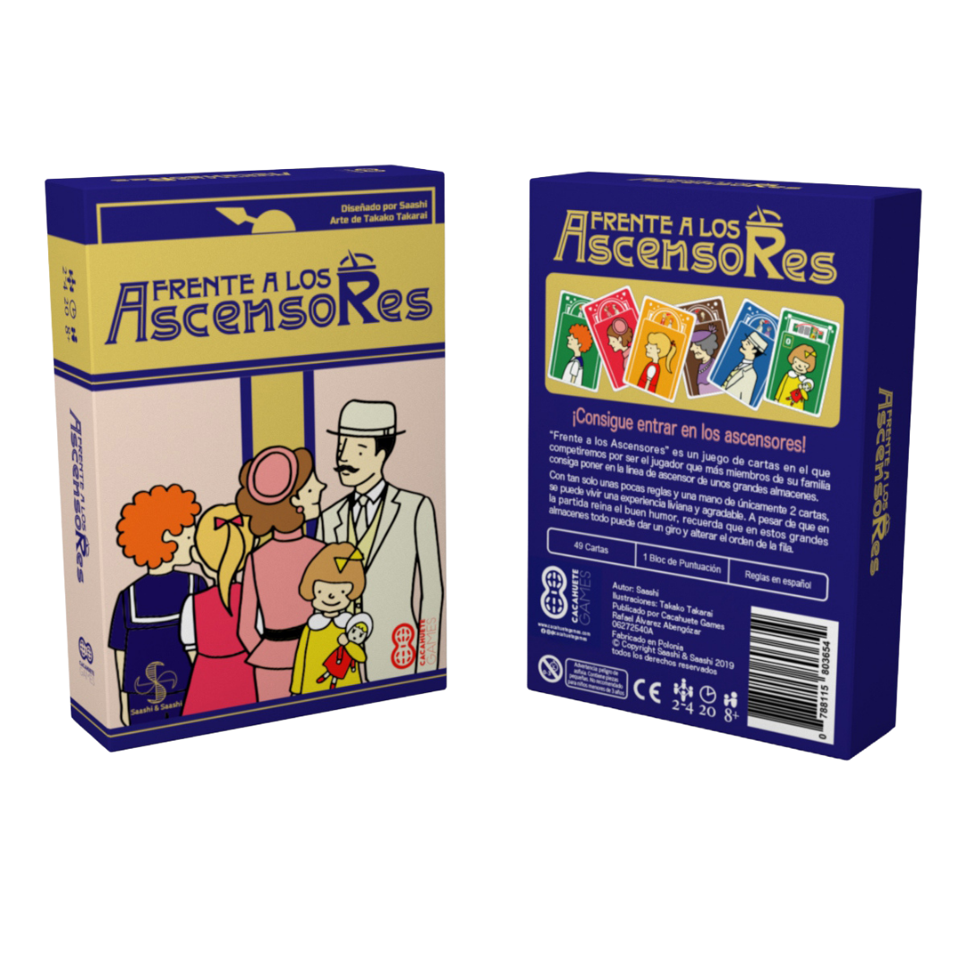 “Frente a los Ascensores” es un juego de cartas en el que competiremos por ser el jugador que más miembros de su familia consiga poner en la línea de ascensor de unos grandes almacenes.