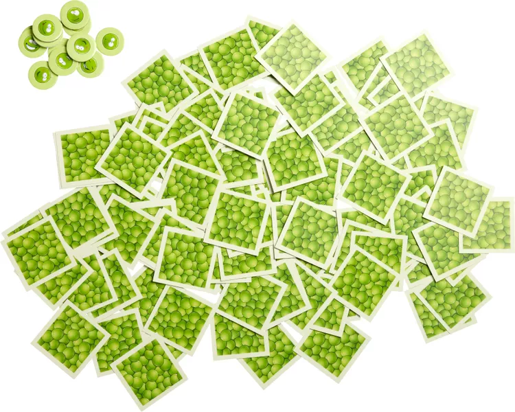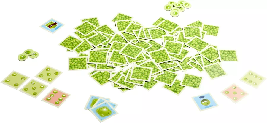 123 cartas de guisantes (87 cartas de puntos-guisante, 21 puré de guisantes, 5 ladrones de guisantes, 5 guisantes de la mala suerte, 5 guisantes de bonificación), 12 megaguisantes (puntos de victoria), instrucciones del juego.