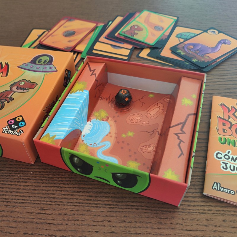 Kaboom Universe es un adictivo juego de cartas, que destaca por su modo competitivo, estilo set collection, con un final marcado por la carta Kaboom. Los jugadores deberán tratar de almacenar dinosaurios, para rescatarlos, mientras los otros jugadores y los meteoritos – dados de 12 caras – intentan destruirlos. El juego lo completa su modo cooperativo.