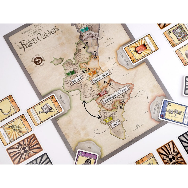 El tablero representa el mapa del Reino de la Fallera Calavera sobre el que irá desplazándose un peón de La Fallera. El Reino está dividido en 5 demarcaciones, llamadas terretes. En función de la terreta donde se encuentre la zombi, ella pedirá las comidas típicas de una u otra zona y activará efectos especiales y bonificaciones de algunas cartas.