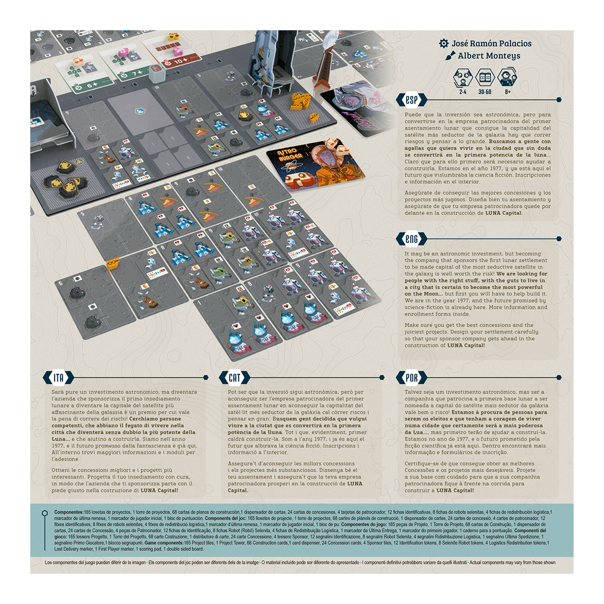 ¡Bienvenidos a la luna! Estamos a finales de los años 70 del siglo XX, y la vida fuera de la tierra ya no es cosa de ciencia ficción. Ayuda a tu empresa patrocinadora y diseña el mejor asentamiento para que tu ciudad selenita consiga la distinción de LUNA Capital. El sueño de mantener vida humana en la luna es ya una realidad. El proyecto de construir ciudades en el satélite terrestre está en marcha a toda velocidad, porque las posibilidades son enormes, y 1977 es el año en el que todo esto va a convertirse en una realidad. Las empresas más emprendedoras se han lanzado a patrocinar equipos de científicos, constructores, publicistas y profesionales liberales del ocio nocturno para que les construyan la mejor base de clientes de la galaxia. Además, el recién formado Organismo Sancionador Lunar otorgará la capitalidad del satélite al mejor de los proyectos que se presenten, ¡así que la recompensa es doblemente jugosa! LUNA Capital es un juego de José Ramón Palacios (La Viña), un autor ya consolidado que con su segundo título nos propone una experiencia muy interesante tanto para jugadores experimentados como para aquellos que se estén iniciando en el mundo del juego de mesa moderno. En el apartado artístico contamos otra vez con la labor y el buen hacer de Albert Monteys (Castellers, Dungeon Raiders). Monteys, aparte de un avezado jugador, es un dibujante de cómics de solvencia contrastada a nivel internacional. Todos aquellos que disfruten de su trabajo en este juego no deberían perderse su cómic Universo (Astiberri), con el que encontrarán inevitables puntos de contacto. En LUNA Capital los jugadores deberán optimizar los elementos que les propone el juego para construir el mejor asentamiento lunar posible, y hacerlo digno de convertirse en la capital de toda la colonia. Tendrán una serie de cartas de planos de construcción en un “mercado” común, y cada una de ellas estará vinculada a un número de losetas de proyecto. Los jugadores tomarán en su turno una de las cartas y las losetas que la acompañan, y las dispondrán en su zona de juego personal. Las cartas deberán disponerse en un máximo de tres filas, y colocarse siempre respetando su valor numérico ascendente. Una vez colocada la carta, se pondrán las losetas en los espacios previstos en las cartas, intentando agrupar los proyectos del modo más eficiente posible. Las losetas muestran los proyectos disponibles, indispensables para construir una ciudad en condiciones. Tales como colectores de oxígeno, invernaderos, complejos residenciales y (muy importante) oficinas de ventas para vender los pisos con las mejores vistas de la galaxia. Cada una de estas categorías puntuará según queden dispuestas en el área personal de cada jugador, y quien consiga sacarle el mayor provecho se hará con la alcaldía de LUNA Capital.