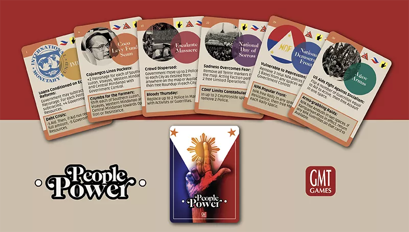 People Power: Insurgency in the Filipinas, 1983-1986 es el volumen XI de la popular y elogiada serie COIN diseñada originalmente por Volko Ruhnke. Este es uno de los dos únicos juegos de la serie COIN que presenta tres facciones separadas, en lugar de las cuatro habituales.
