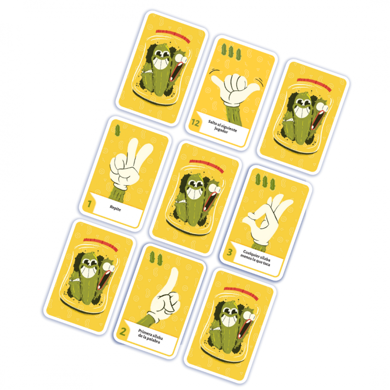 Bienvenidos a «Pepinillo» donde los participantes crean una cadena fluida de sílabas que se suceden sin parar. Realiza gestos y utiliza sus efectos de la manera más eficaz. Si alguno se equivoca, es penalizado. El jugador con menos pepinillos al final de la partida será el ganador
