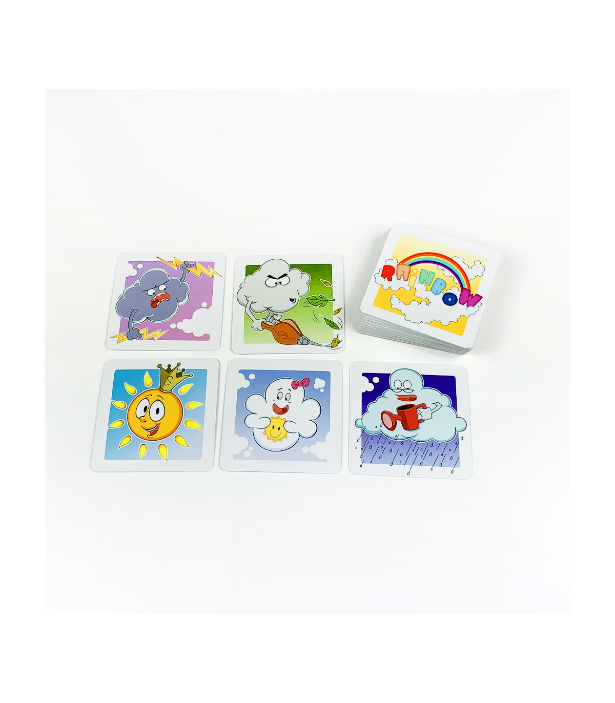 El juego contiene un mazo con cartas de 69×69 mm. Existiendo dos tipos de cartas, las de los siete colores del arcoíris y las de climatología, esto es, sol y lluvia por un lado, y viento, nubes e incluso tormentas por otro.