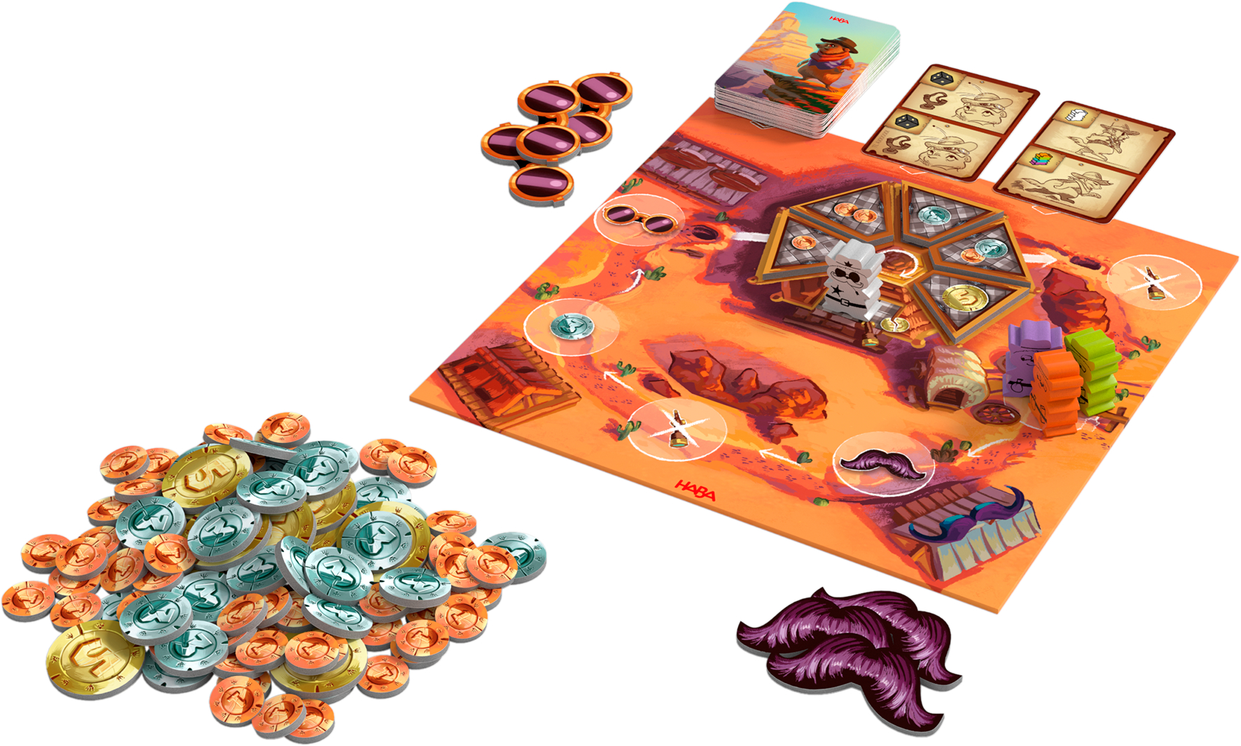 1 tablero, 5 cámaras acorazadas, 8 disfraces, 4 bandidos, 1 sheriff, 60 cartas, 4 marcadores, 4 cajas de caudales, 2 dados, 96 monedas, 1 instrucciones del juego