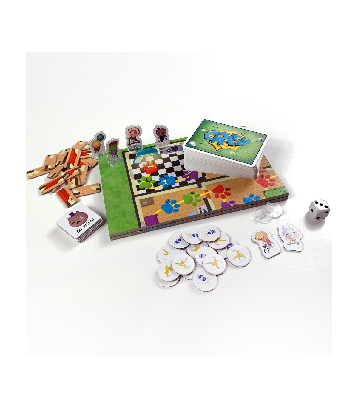 El juego contiene un tablero de la casa, fichas con peanas de las mascotas protagonistas, mazos de cartas de acciones y eventos, tokens de “trampas” y puertas, así como el dado de juego.