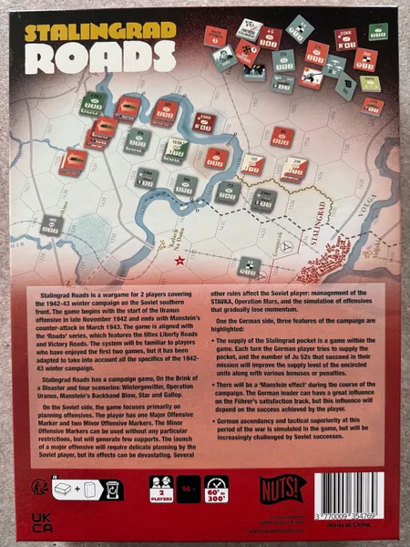 Stalingrad Roads es un juego de mesa de tipo wargame para 2 jugadores que cubre la campaña de invierno de 1942-43 en el Frente Sur Soviético. El juego comienza con el estallido de la ofensiva Urano a finales de noviembre de 1942 y termina con el contraataque de Manstein en marzo de 1943. El juego está alineado con la serie ‘Roads’, que incluye los títulos Liberty Roads y Victory Roads (publicados por Hexasim). El sistema será familiar para los jugadores que hayan disfrutado de los dos primeros juegos, pero se ha adaptado para tener en cuenta todas las especificidades de la campaña (el suministro del bolsillo de Stalingrado, la gestión del Stavka, …).