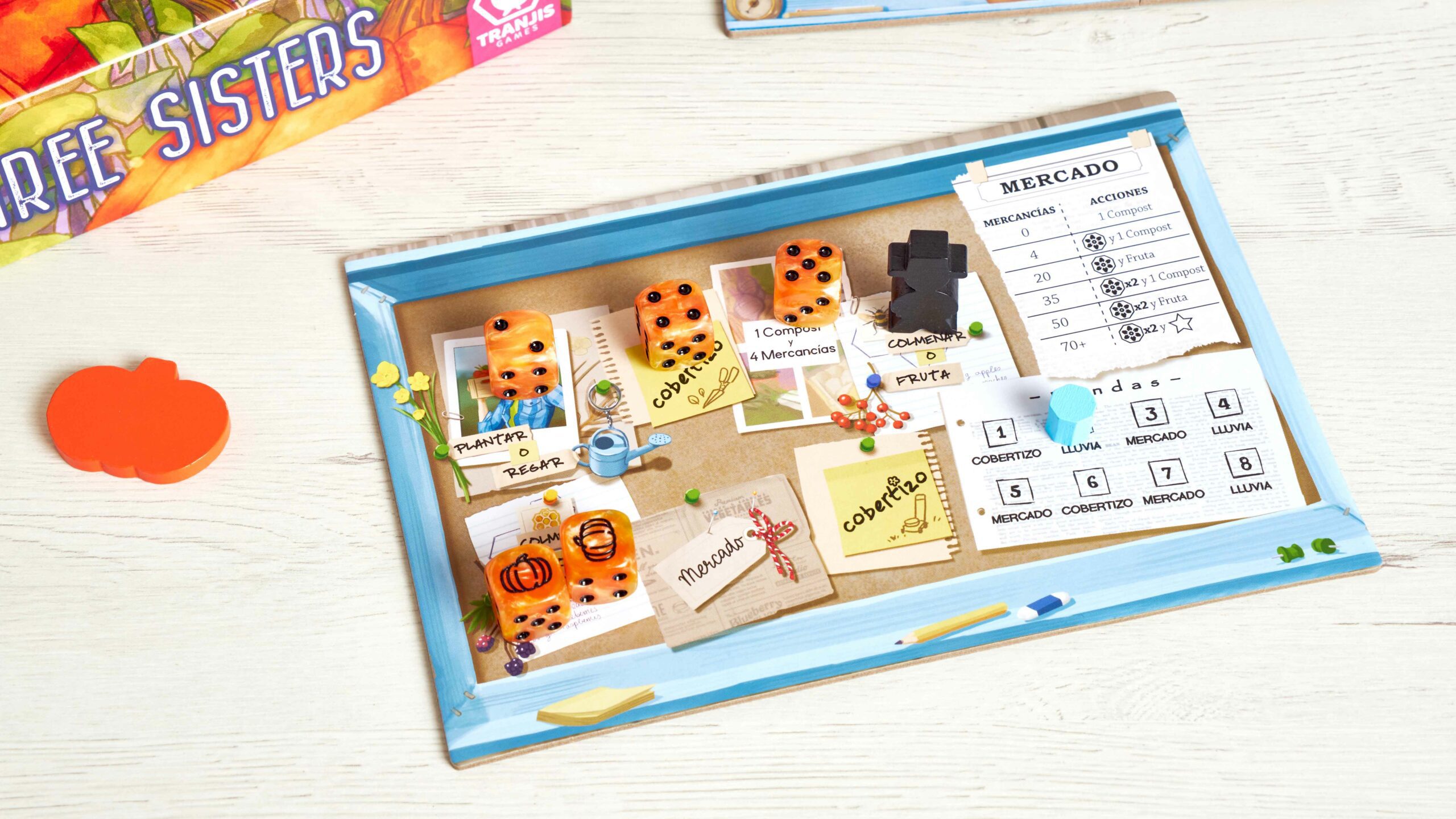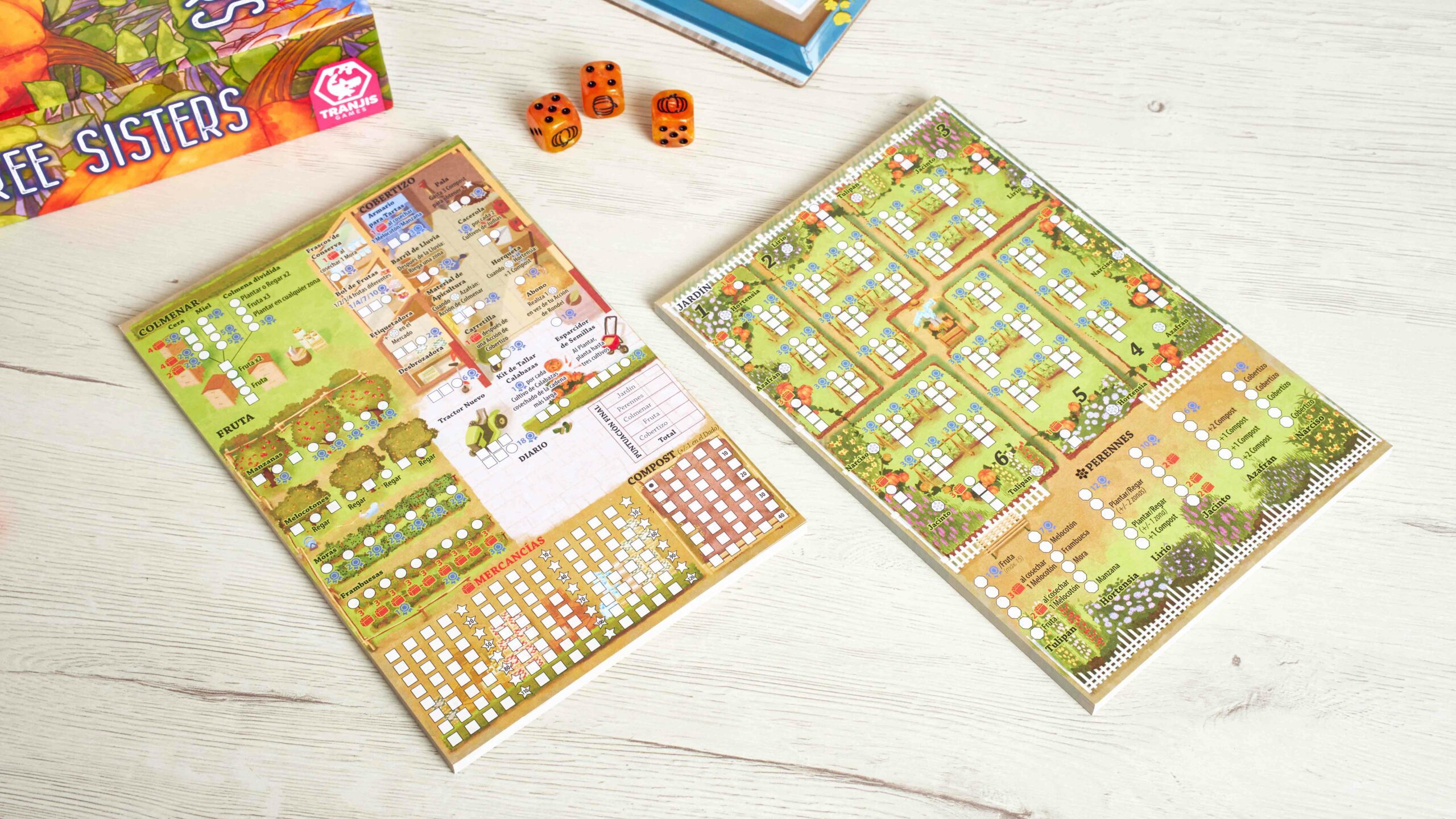 Three Sisters es un Roll&Write de estrategia en el que cada persona tiene un campo con 3 cultivos diferentes y 6 zonas para plantar.