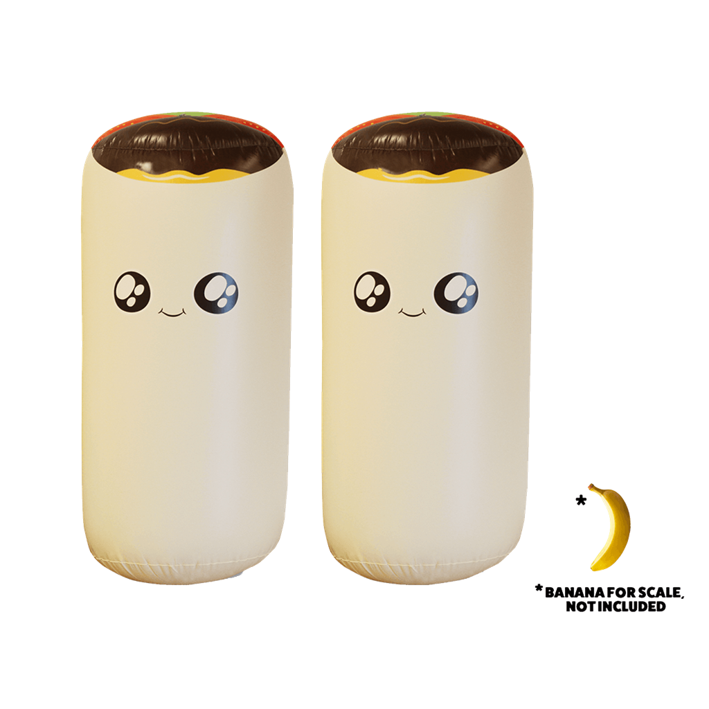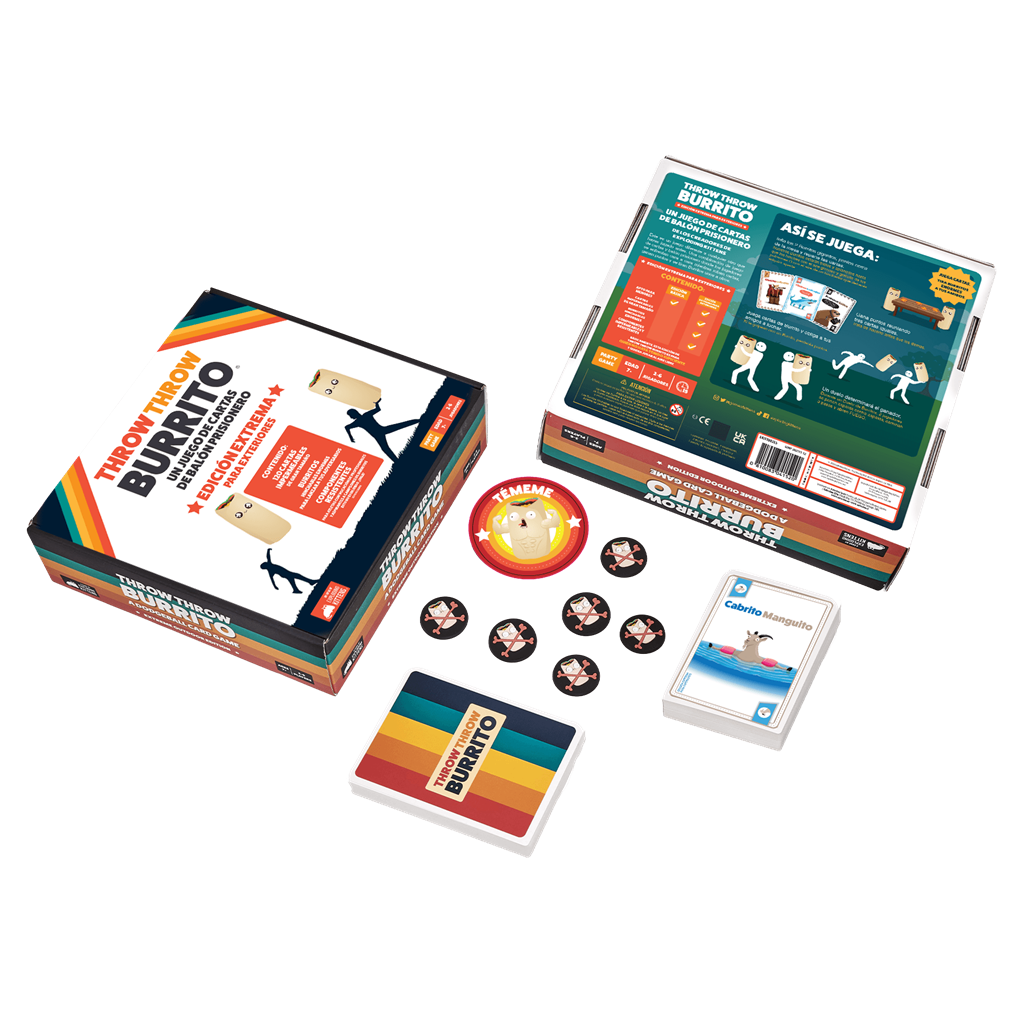 Ya conoces Throw Throw Burrito… ¡Pues ahora prepárate para su versión más extrema! El mismo ritmo frenético y la misma diversión, solo que ahora todos los componentes son mucho más grandes empezando, como no, por dos adorables burritos hinchables con los que protagonizarás las batallas más encarnizadas y los duelos más intensos con tus amigos en el parque, la playa, el campo… ¡O donde se te ocurra siempre y cuando haya espacio para perseguiros unos a otros con un burrito gigante entre las manos!