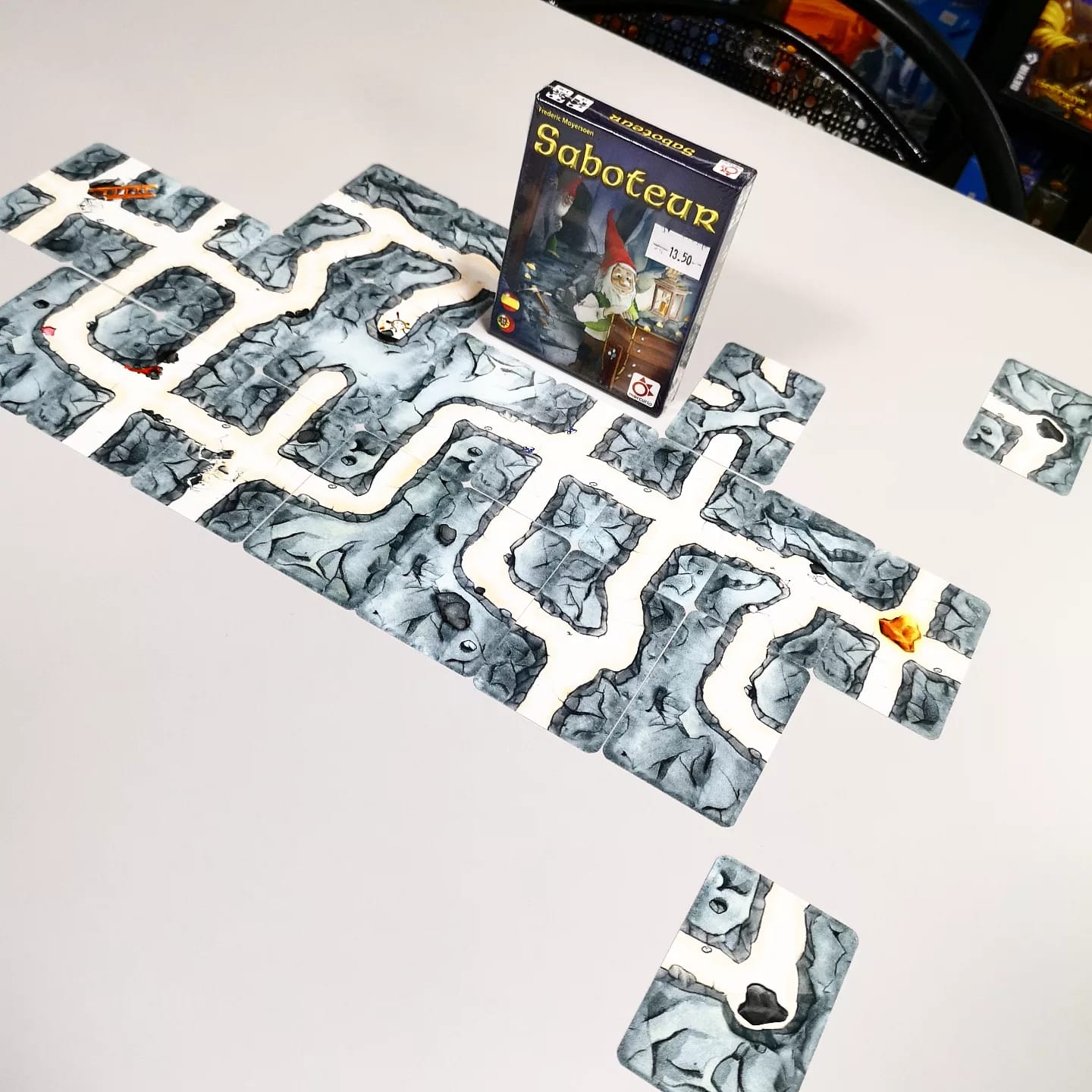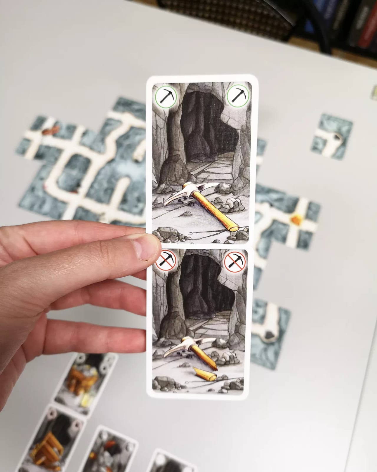 Entre vuestras cartas podréis tener, además de los túneles, cartas de acción: mapas, derrumbes, herramientas rotas y reparaciones de herramientas rotas. Si te sale una carta de mapa podrás voltear en secreto una de las 3 cartas de destino para comprobar si debajo de ella está la pepita. Con la carta de derrumbe podrás descartar una de las cartas de camino que ya haya sido jugada sobre la mesa, así que sirve tanto para los buscadores como para el saboteador, que querrá que no podáis continuar el camino hasta rellenar el hueco que deje la caída de las rocas. Si tienes dudas de algún compañero o simplemente quieres fastidiarle, puedes echarle una carta de herramienta rota, es decir, rómpele el faro, el pico o la carretilla para que no pueda seguir construyendo y no podrá quitársela hasta que juegue (él mismo u otro jugador sobre él) una carta de reparación de esa herramienta que se le ha quitado. Si llegáis al final del túnel y conseguís el tesoro, cogeréis tantas cartas de pepitas como jugadores haya y os las repartiréis de una en una empezando por el jugador que haya puesto la última carta de camino. Ganará quien haya conseguido más pepitas al final de las 3 rondas.